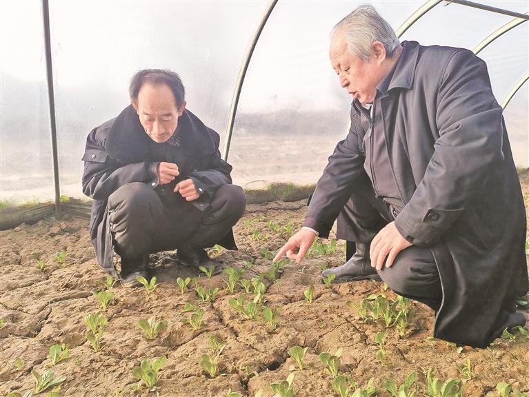 蒋儒龄站在大棚门口看了看蔬菜整体长势,又摸了摸棚膜的温度,提醒道:“这几天寒潮来了,晚上温度太低,你要做好防寒防风,一旦冷风进来,菜就没了!”蒋儒龄蹲下身,扒开一株油菜的根部说:“看,长势不错,让植株壮实起来,晚上才扛得住冻。”
